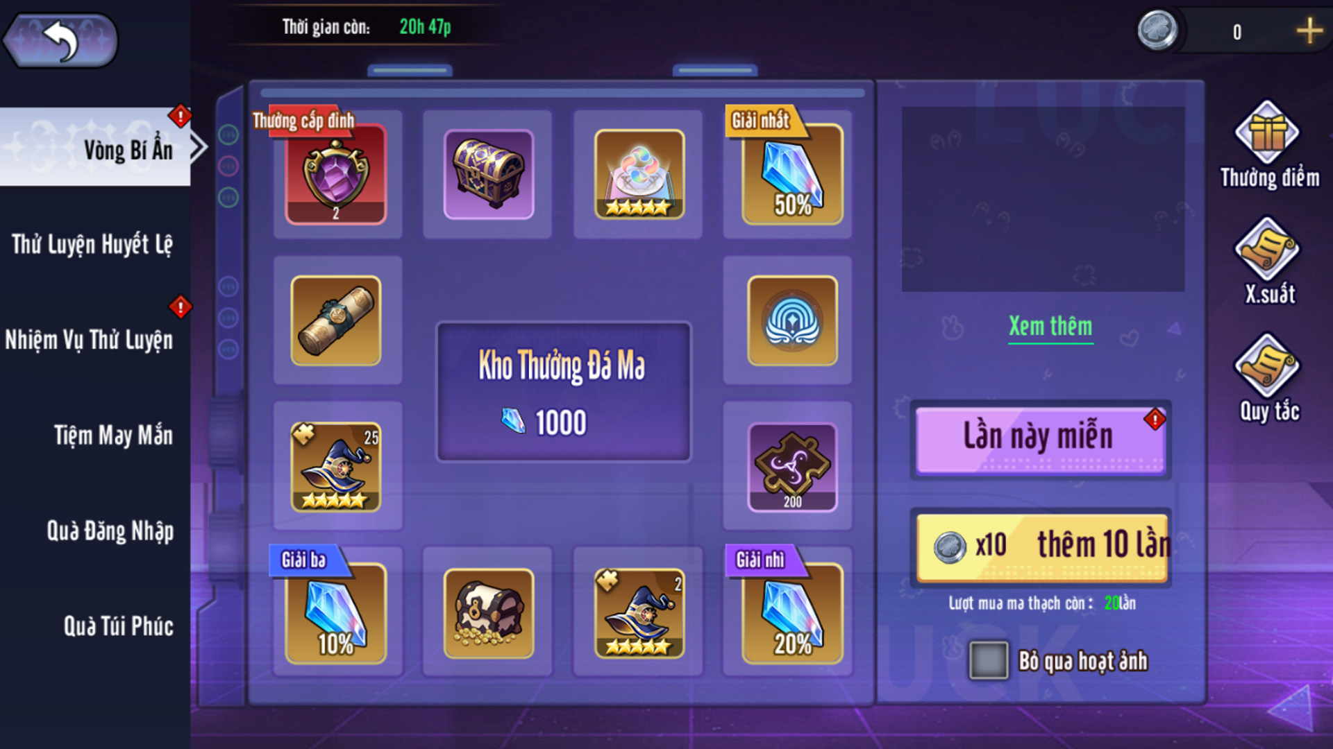 - Có thể dùng Đá Ma Thuật mua xu để quay