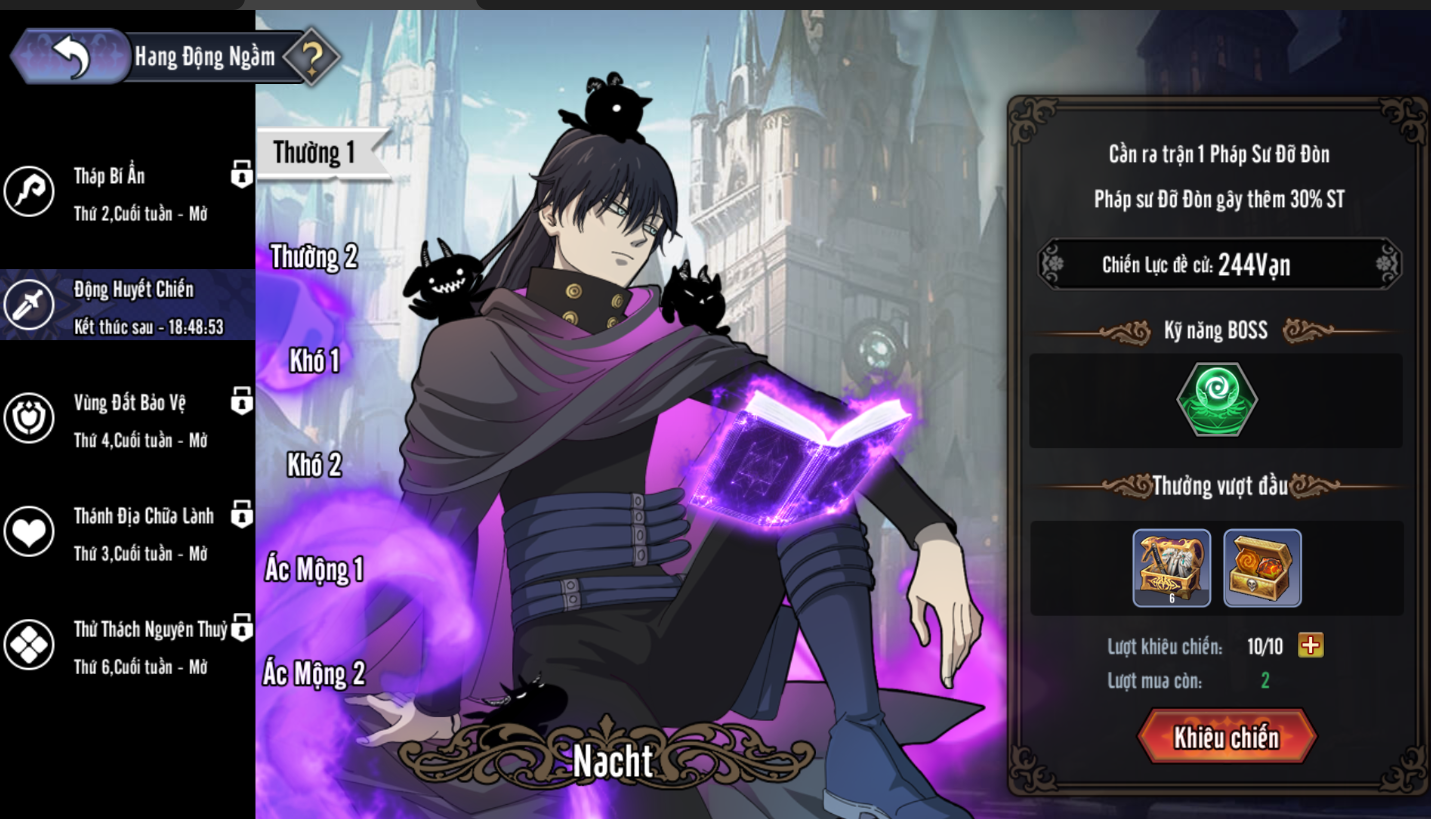 - Động Huyết Chiến : nhận trang bị pháp sư hệ Chiến Sĩ